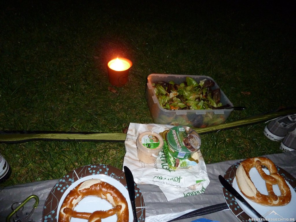 Noch sechs Heringe in den Boden, Wind hatten wir keinen, also konnten wir uns die Schnüre zur Stabilisierung sparen und ab ging es an die dringend notwendige Brotzeit. Ursprünglich war grillen angedacht, da wir uns aber vor der Abfahrt noch einen Snack genehmigten, stürzten wir uns einfach auf die Bretzel, den Spundekäs‘ und den von Eva mitgebrachten Salat.