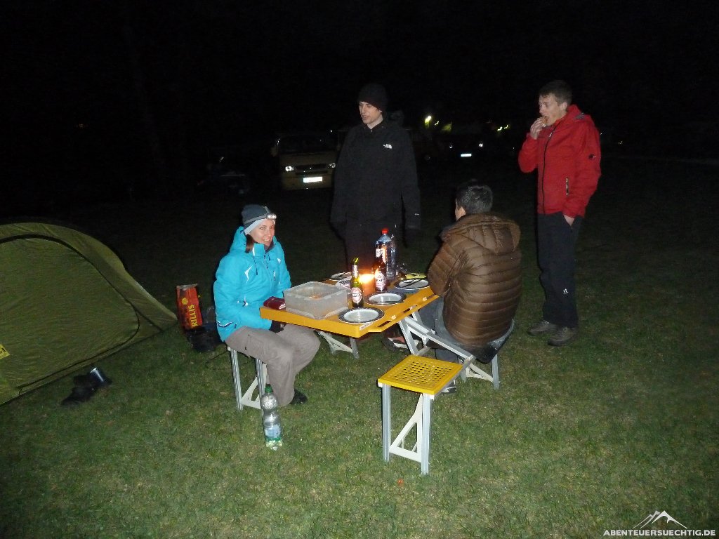 Bis wir drei mit der Route fertig waren, war es auch schon fast dunkel, deshalb ging es dann doch gleich hinüber auf den Campingplatz. Tobi und Vera waren mit dem Aufbau ihres Zeltes zwischenzeitlich schon so gut wie fertig, also wurde mit dem Grillen begonnen.