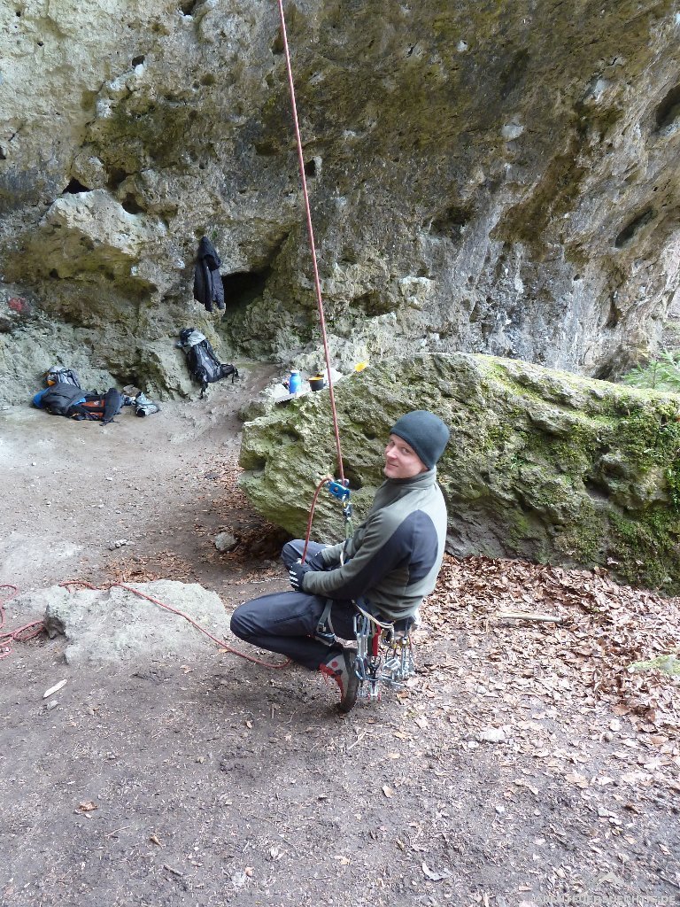 Am Diebesloch angekommen machten wir zuerst Bekanntschaft mit zwei anderen Kletterern, die wohl in der Gegend wohnten und nach zwei oder drei Minuten erzählen ankündigten, jetzt heim zu fahren und eine Brotzeit einzulegen. Auf meinen Kommentar, sie sollten uns was zu essen mit mitbringen wurden wir spontan zu den beiden zum Mittagessen eingeladen (falls ihr das hier lesen solltet, danke noch mal für das Angebot!), wir lehnten jedoch dankend ab, da wir ja gerade erst angekommen waren und klettern wollten. Bevor die beiden uns verließen, wurde jedoch noch etwas über die einzelnen Routen und die Möglichkeiten des selbst absicherns gefachsimpelt.