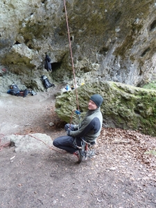 Da für die kommende Nacht Temperaturen von bis zu -7°C gemeldet waren, beschlossen wir, im wahrsten Sinne des Wortes, die Zelte abzuschlagen und die Nacht von Sonntag auf Montag in Fürth bei Flo’s Eltern zu verbringen. Die Aussicht auf ein warmes Bett, ein normales Badezimmer und die Sauna waren dann doch zu gut… Es stand nun noch die Qual der Wahl bevor, welchen Felsen wir an diesem Tag beklettern sollten. Diese fiel nach kurzer Überlegung auf den „Röthelfels 14 – Sektor Daniel„. Der Röthelfels ist riesig, mit insgesamt 17 Wänden und was weiß ich wie vielen Routen ist hier für wirklich jeden etwas dabei. Der Zustieg zum Fels Daniel dauert ca. zehn Minuten und ist relativ leicht zu bewältigen. Oben angekommen stürzten wir uns direkt in die ersten Routen. Ich begann mit „Kokolores (6)„, was so viel bedeutet wie Unsinn, eine wirklich tolle, rund 30 Meter lange Route. Zuerst geht es mehr oder weniger senkrecht nach oben und leicht nach rechts, dann steht man auf dem Daniel, einem kleinen Felsteil, von dem aus man über eine kleine, etwa einen Meter breite „Schlucht“ auf den Röthelfels steigen/springen muss. Hört sich alles deutlich schlimmer an, als es ist, auf der Seite der Route (siehe Link oben) ist ein gutes Bild von dieser Stelle zu sehen. Nach dem Überstieg kommt eine etwas doofe stelle, die es zu bewältigen gilt, aber dann geht es an schönen Henkeln wieder weiter bis ganz nach oben. Auch wenn die Route mit UIAA 6 nicht sonderlich schwer ist, ist sie definitiv einen Versuch wert!